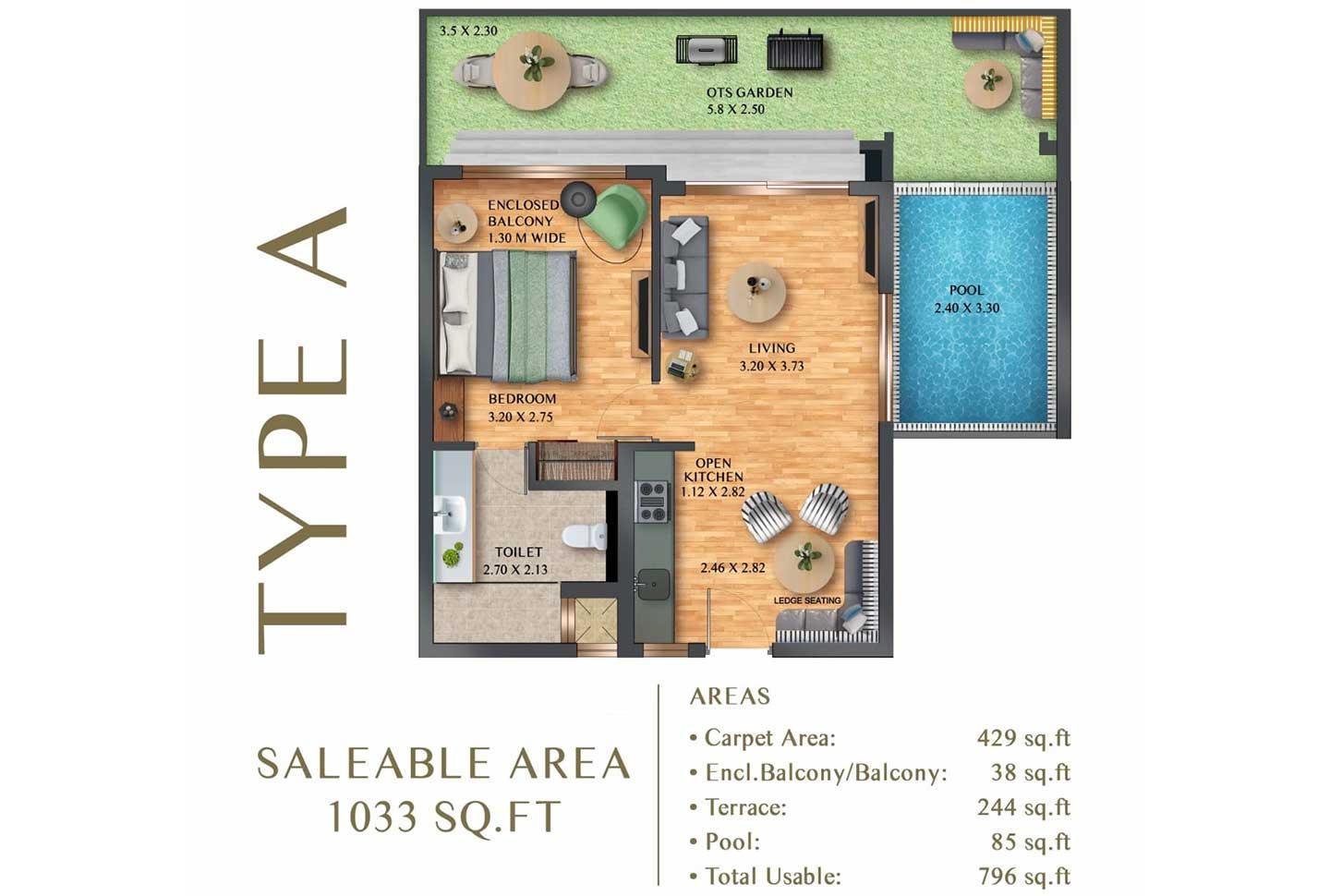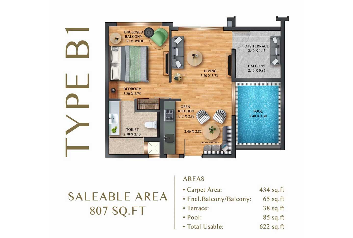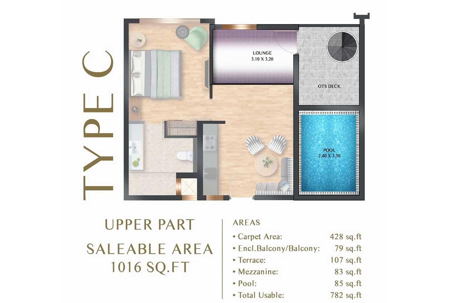 Carpet Area : 622 Sq.ft, 782 Sq.ft, 796 Sq.ft. (With Terrace, Balcony & Pool)