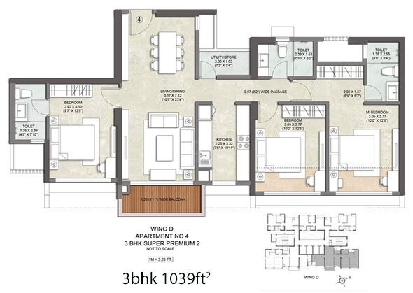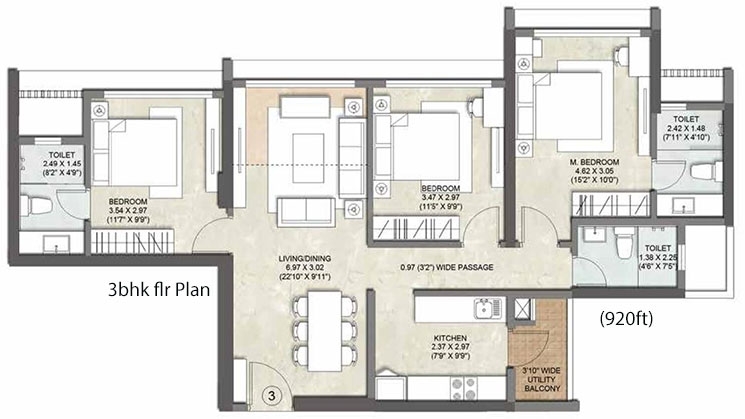 Carpet Area : 920 Sq.ft, 957 Sq.ft and 1039 Sq.ft