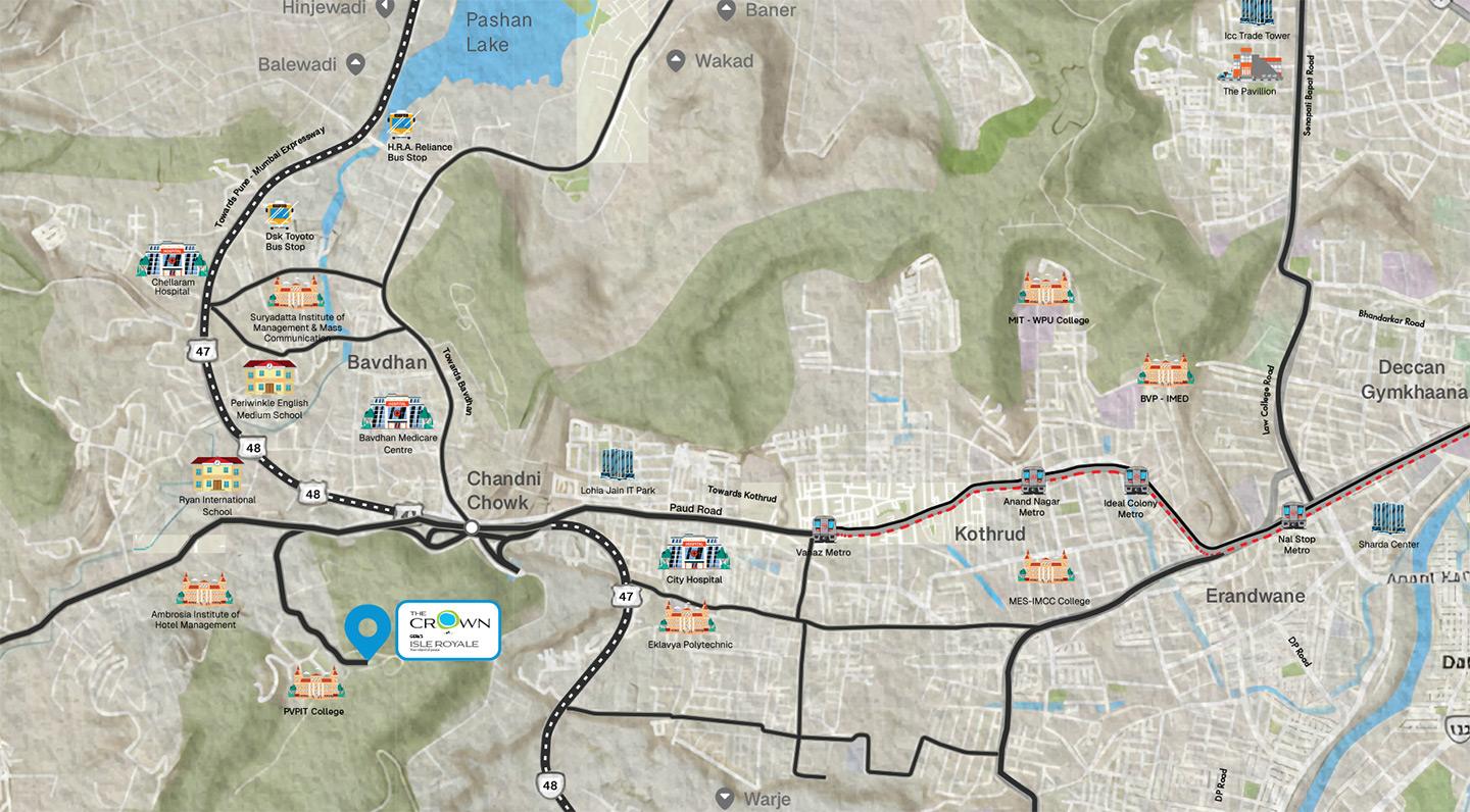 This is a meticulously designed 4.5 BHK Flat with an Carpet area of 2566 Sq.ft for Sale. Located in Chandani Chowk, Bavdhan, Pune. The Flat is a spacious property and is New Launch. Located in an integrated society of The Crown at Geras Isle Royale , the Flat consists. This is a feng shui/vaastu compliant property and has Vitrified flooring. It is a property located on the Higher Floor floor. The unit is located in a gated society. The property offers facilities. The price of the property is estimated at 3.90 Cr. Parking is also available. Please contact for further details.
