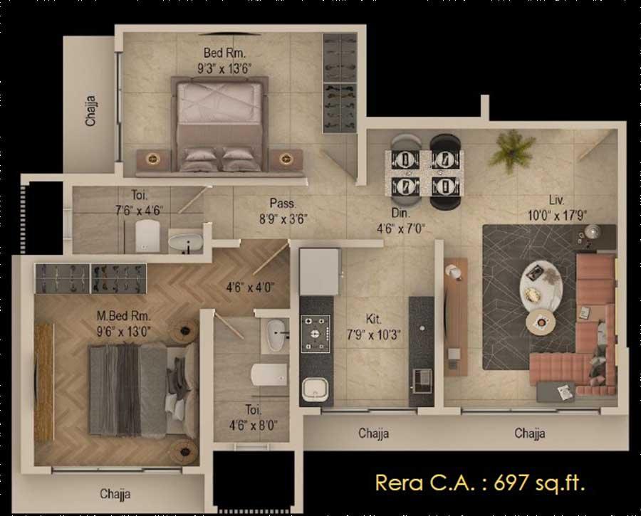 Carpet Area : 697 Sq.ft, 781 Sq.ft.
