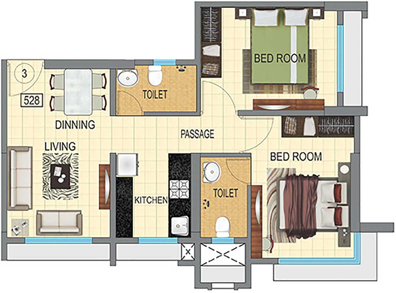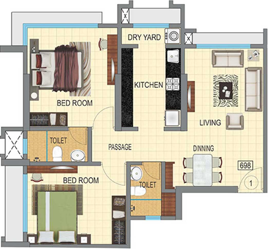 Carpet Area : 528 Sq.ft, 698 Sq.ft.
