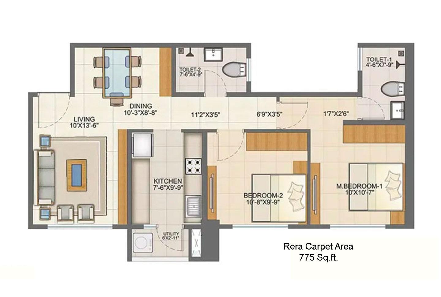 Carpet Area : 784 Sq.ft, 873 Sq.ft.